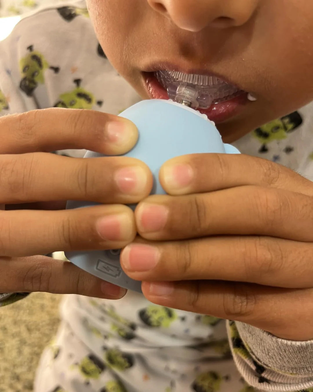 Con DinoCepillo™, todo es mucho más sencillo: el cabezal en forma de U envuelve todos los dientes al mismo tiempo, mientras que la suave vibración sónica limpia a fondo, sin necesidad de cepillar manualmente. ¿El resultado? Una higiene dental impecable, incluso en total autonomía.