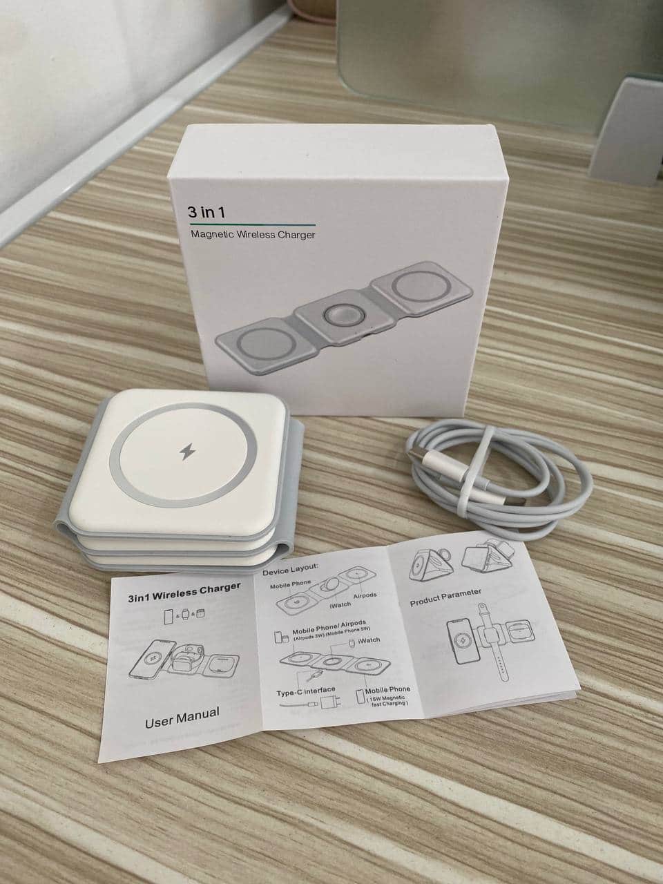 LO QUE RECIBIRAS: En la caja:1 cargador inalámbrico 3 en 11 cable Cable USB-C a USB-C (1,2 m)1 guía de usuario.
