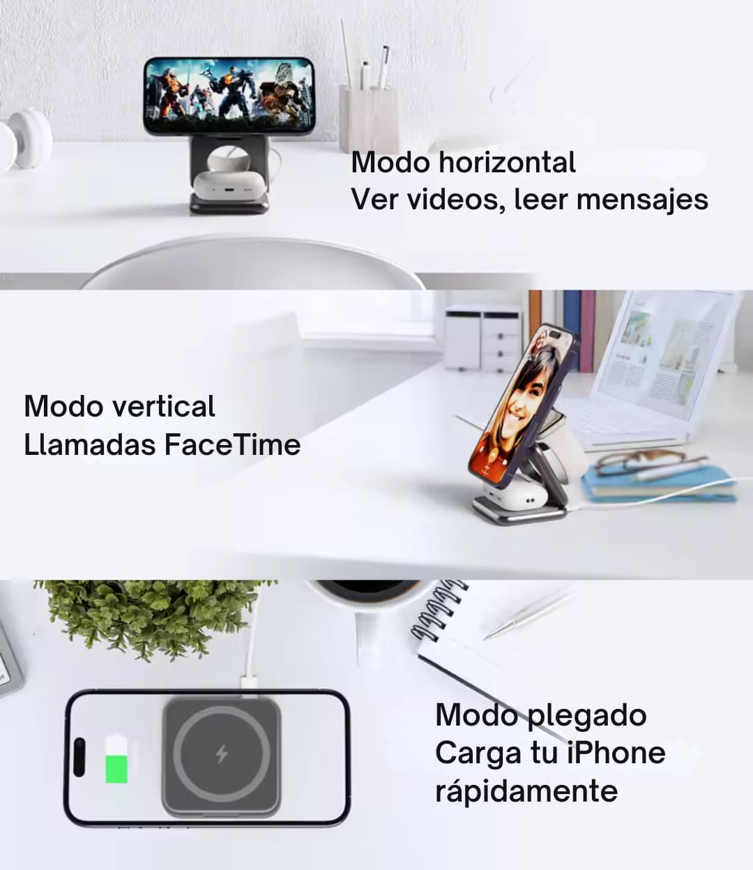- 🔋Carga rápida hasta 15 W para iPhone y 5 W para Apple Watch (sin sobrecalentamientos).